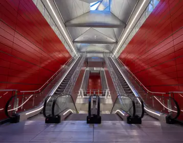 Under jorden er metrostationens vægge beklædt med røde keramiske paneler ligesom væggene på Nørrebro og Østerport.