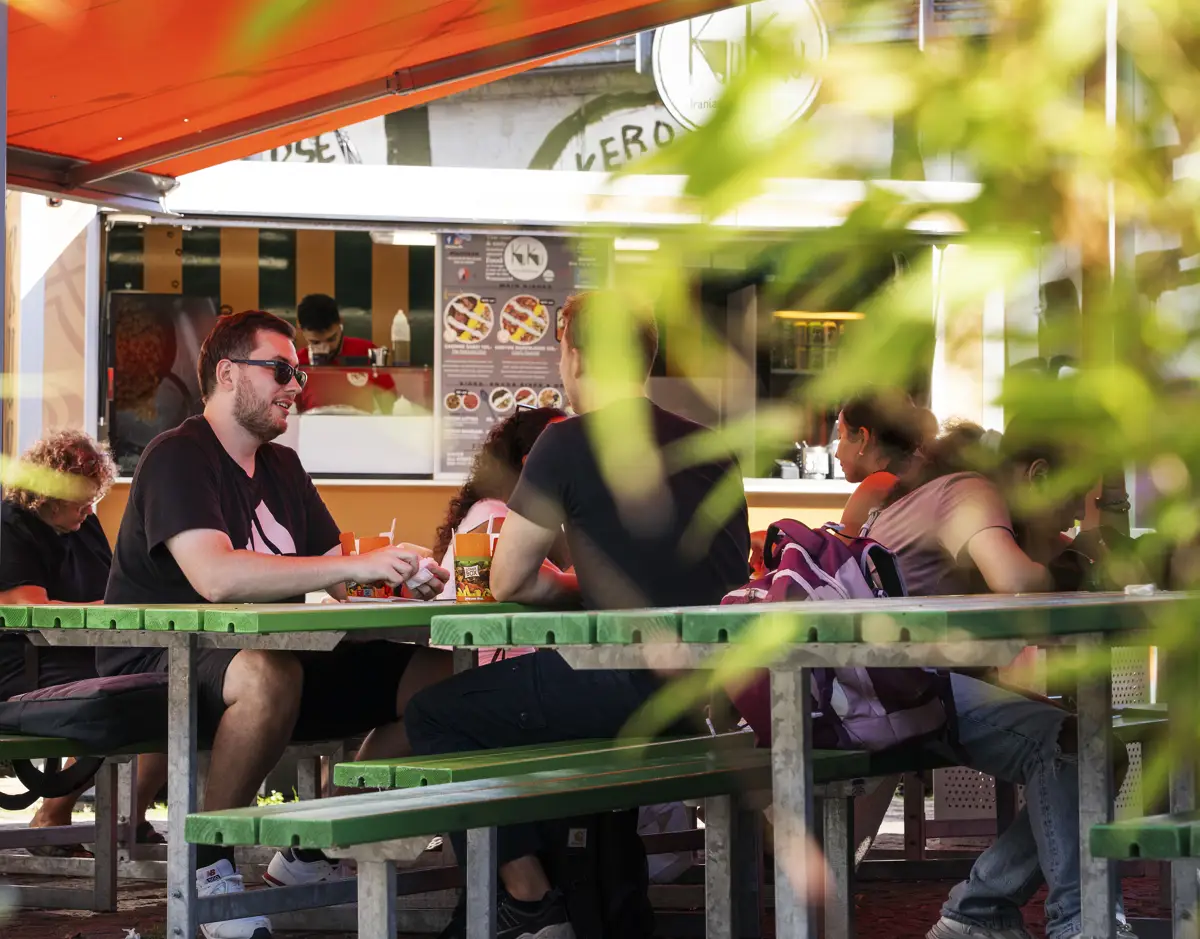I de hyggelige grønne omgivelser kan du nyde madboder, barer og events året rundt. Du kan for eksempel sætte tænderne i autentisk indisk street food fuld af farver og smag fra Dhaba eller sprøde, saftige burgere fra Willys Burger – og skylle det ned med lokalbrygget øl fra Åben.