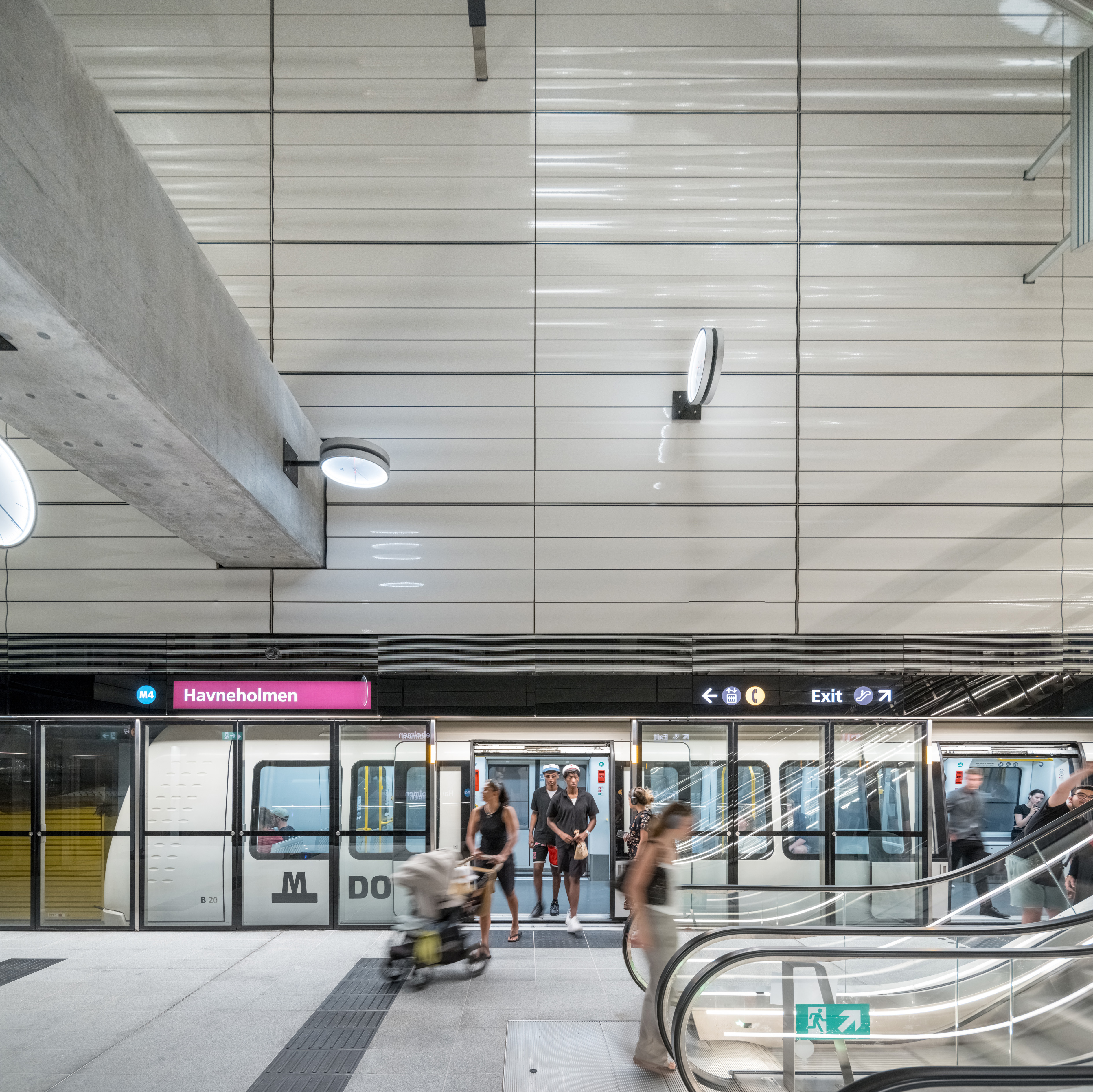 If you look up as you make your way down the escalators at Havneholmen, you might get a little dizzy. The usual metro station fixtures and fittings such as information screens, benches, rubbish bins and travel card stands hang from the ceiling and protrude from the walls.