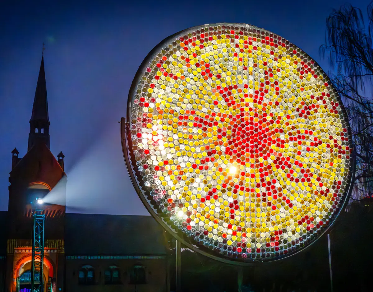 Close to the metro station København Syd, at Vestre Kirkegård, you will find the work Soleil Nuit by Sébastian Levfèvre. It consists of two large discs with 5,000 coloured mirrors that reflect the light and the surroundings, creating a kaleidoscope of colours.
